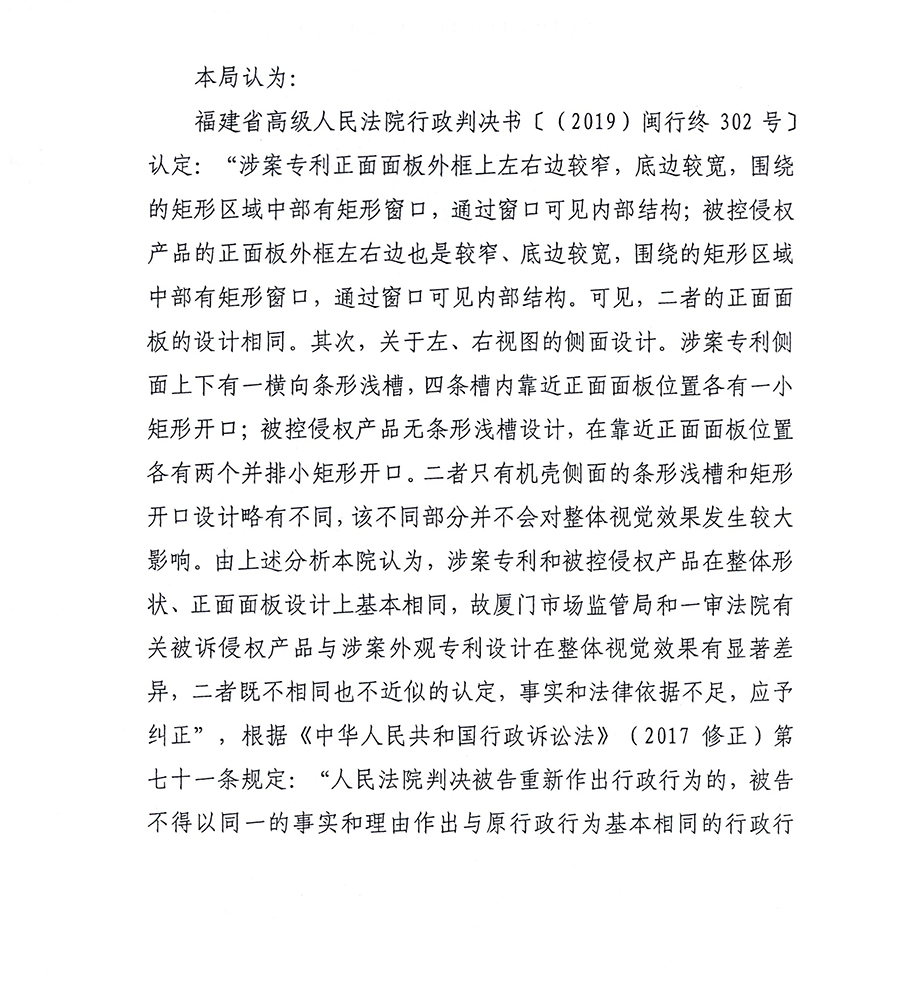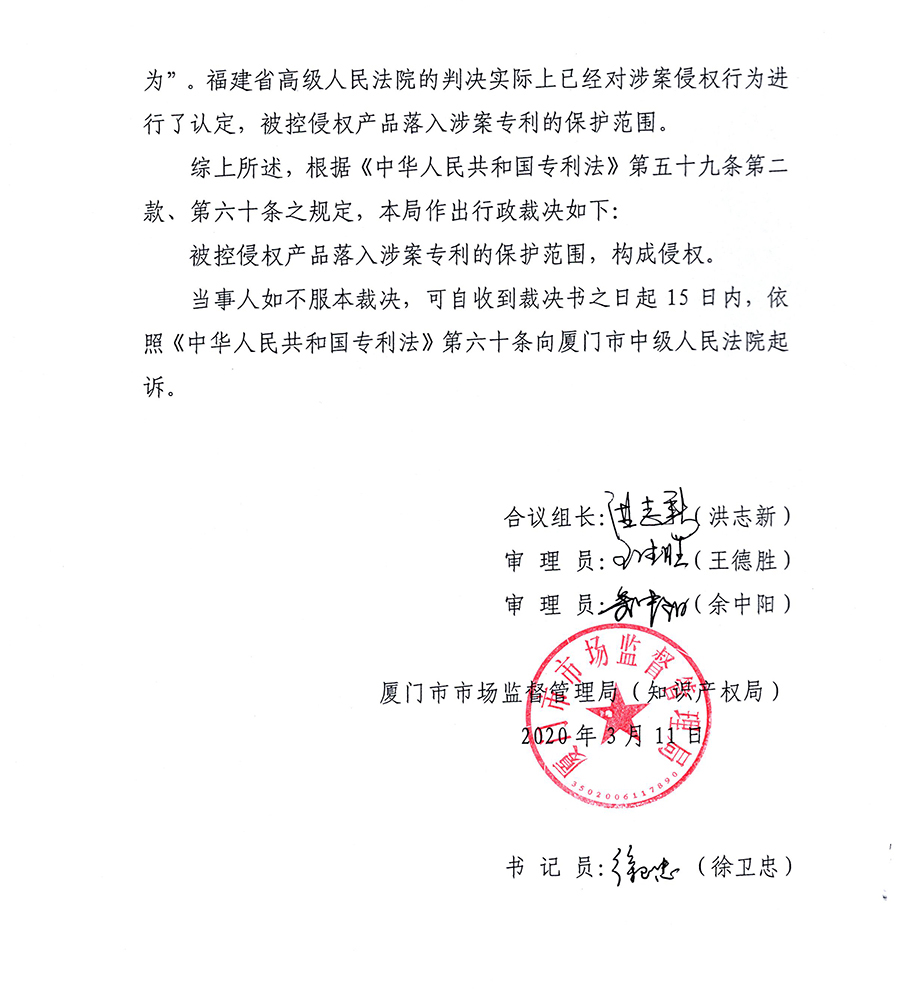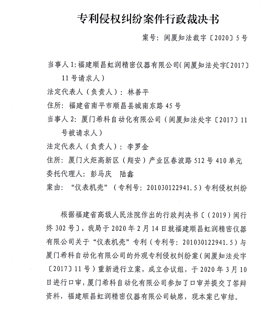 根據(jù)福建省高級人民法院作出的行政判決書[(2019)閩行終302號],廈門知識產(chǎn)權(quán)局于2020年2月14日就福建順昌虹潤精密儀器有限公司關(guān)于“儀表機(jī)殼”專利(專利號:201030122941.5)與廈門??谱詣踊邢薰就庥^侵權(quán)糾紛案(閩廈知法處字[2017]11號)重新進(jìn)行立案,于2020年3月10日作出審結(jié)裁決,認(rèn)定廈門??票豢氐臒o紙記錄儀侵權(quán)產(chǎn)品落入涉案專利的保護(hù)范圍,構(gòu)成侵權(quán)。