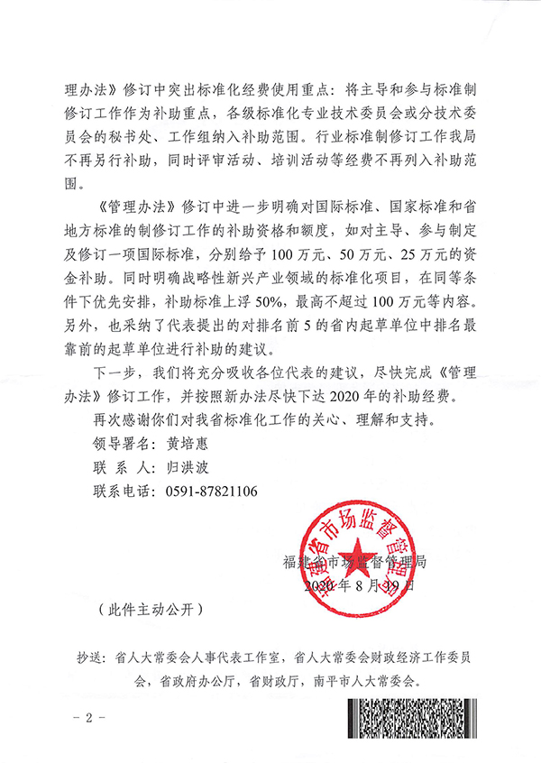 2020年8月19日,福建省市場(chǎng)監(jiān)督局就我的建議作出閩市監(jiān)函[2020]247號(hào)答復(fù),答復(fù)中表示,省政府已批準(zhǔn)新增加1080萬(wàn)元資金用于我省標(biāo)準(zhǔn)化專項(xiàng)資金補(bǔ)助。至此標(biāo)準(zhǔn)化專項(xiàng)資金問(wèn)題得以解決。