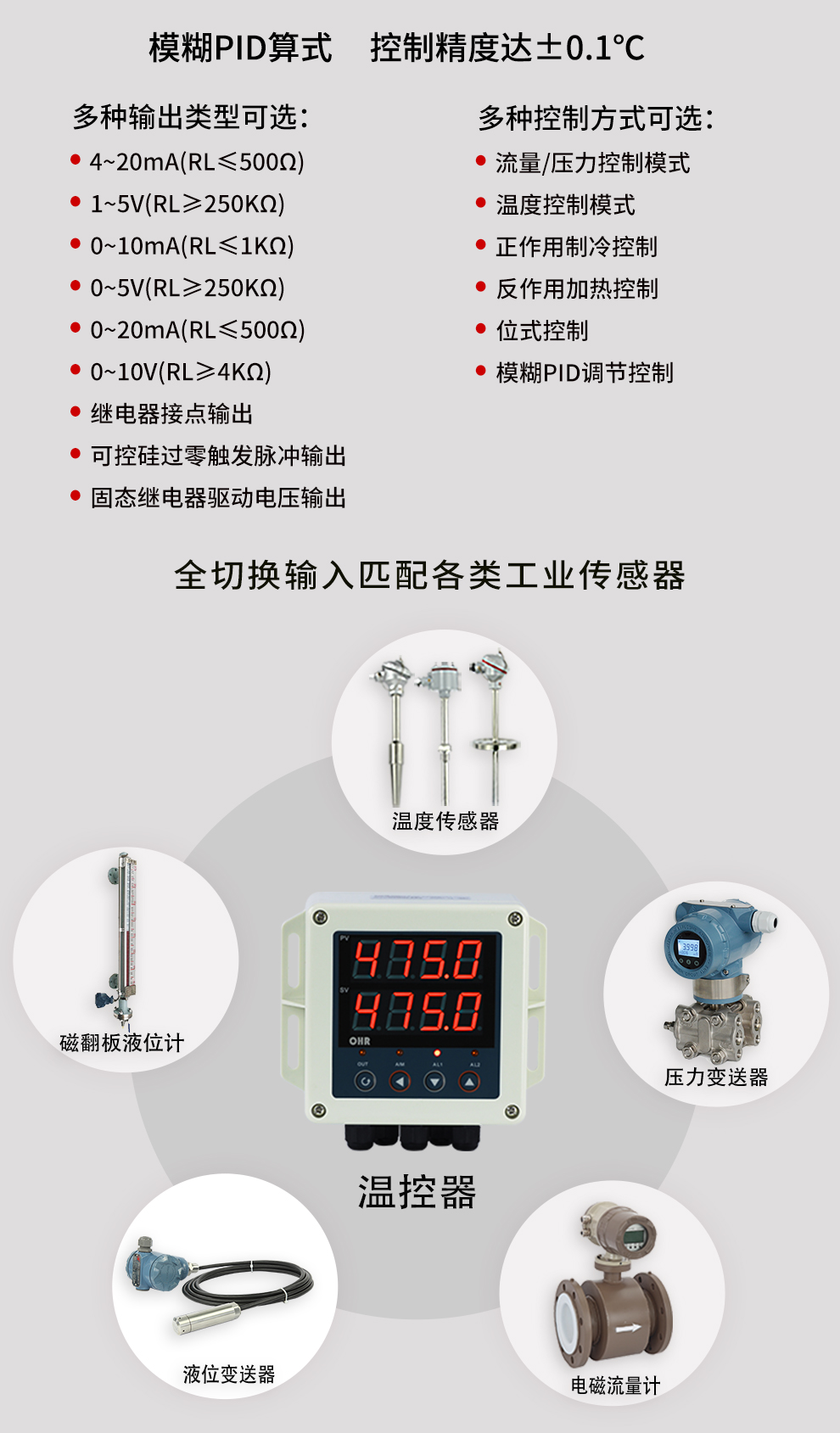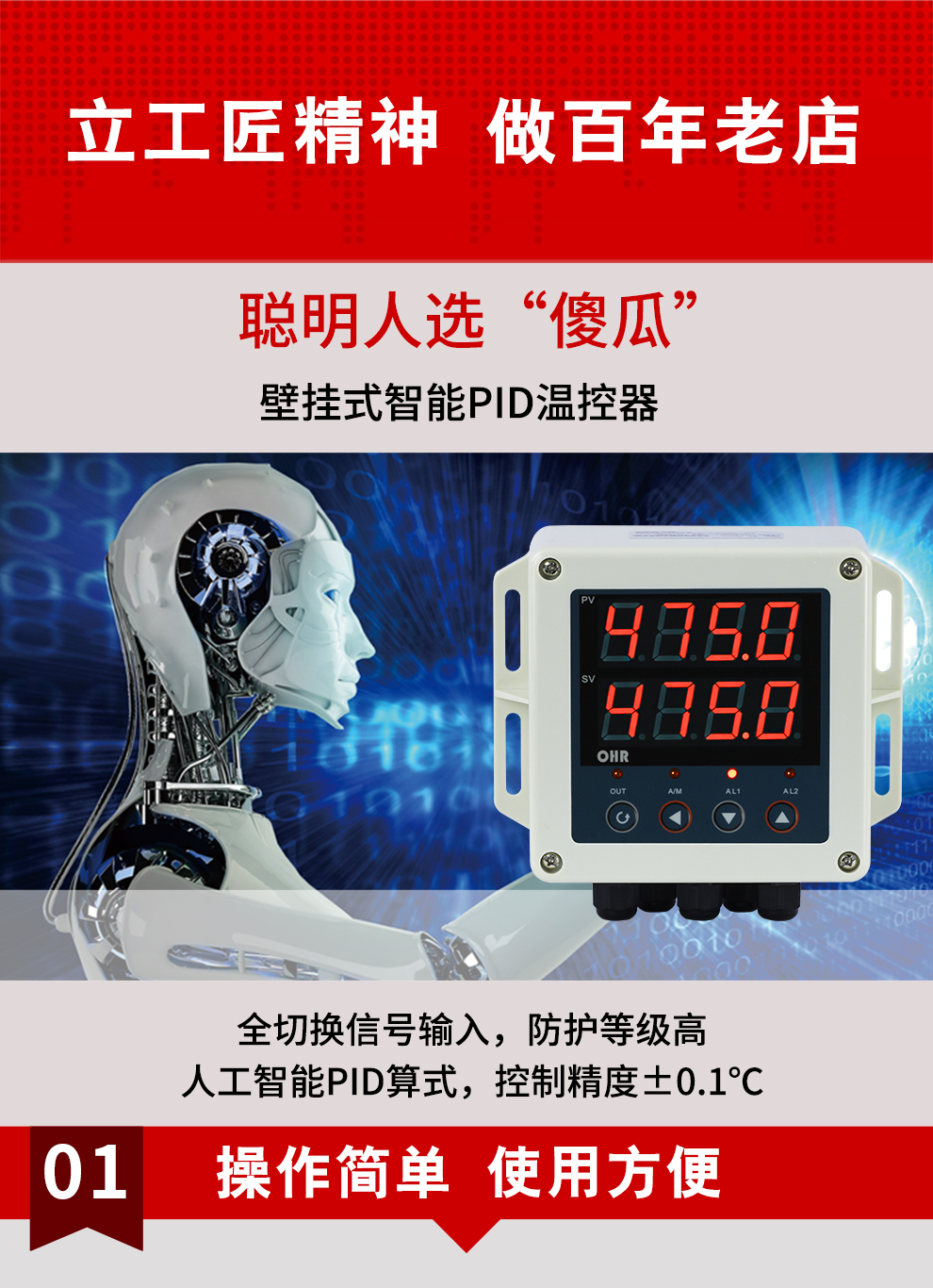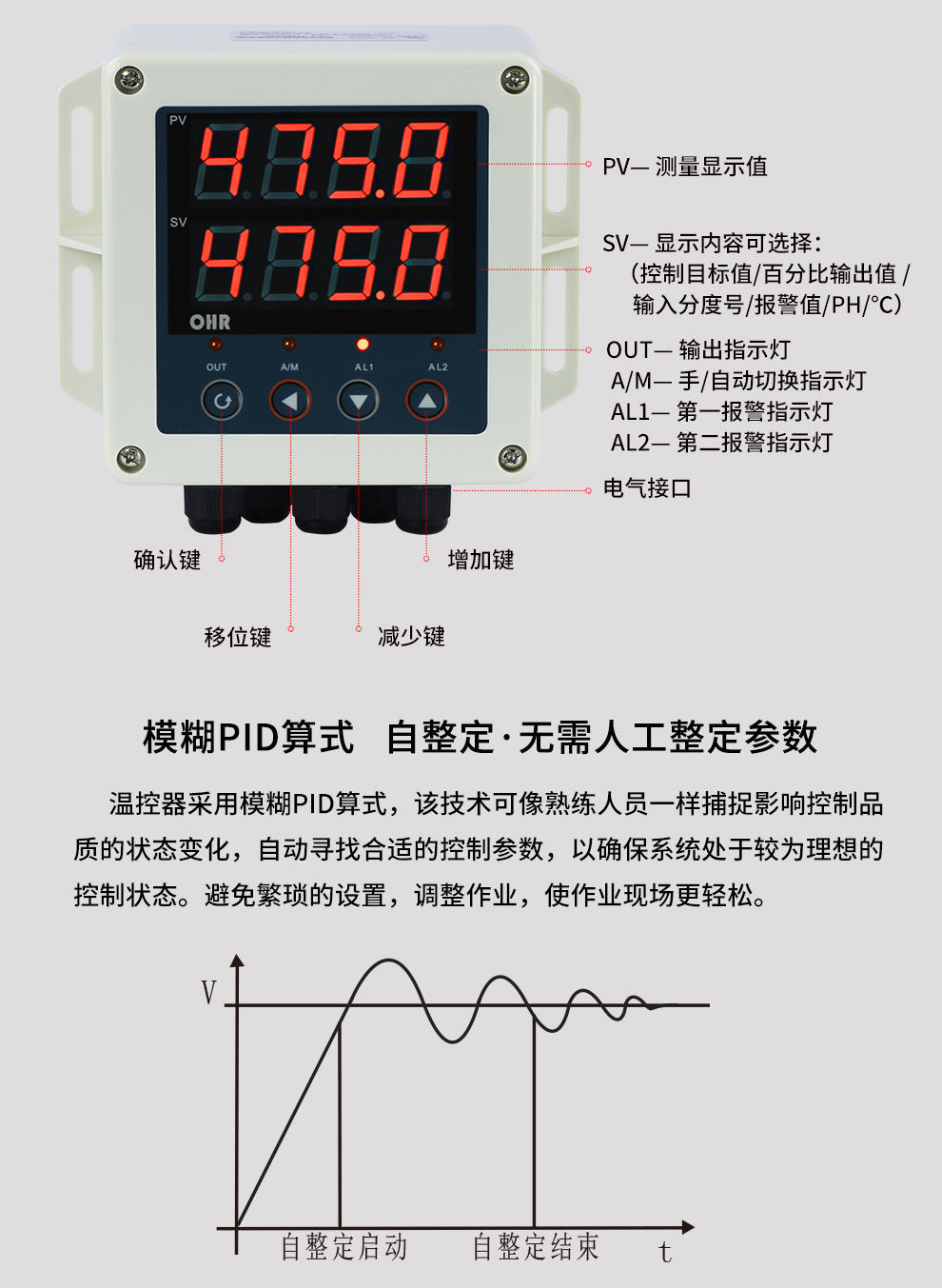 OHR-BG30/BG40系列壁掛式智能溫控器/60段程序溫控器采用了表面貼裝工藝,全自動(dòng)貼片機(jī)生產(chǎn),具有很強(qiáng)的抗干擾能力。本儀表采用人工智能算式,儀表啟動(dòng)自整定功能,可以根據(jù)被控對(duì)象的特性,自動(dòng)尋找參數(shù)以達(dá)到很好的控制效果,無需人工整定參數(shù),控溫精度基本達(dá)±0.2℃,無超調(diào)、欠調(diào),性價(jià)比高。