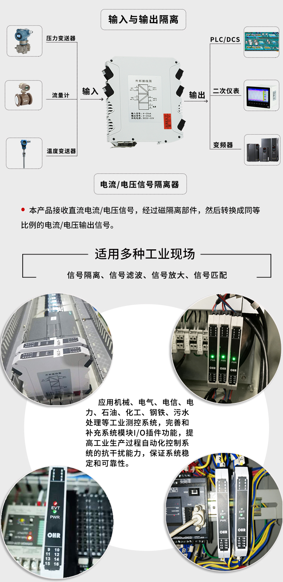 OHR-M21系列電壓/電流隔離器將直流電壓或電流信號(hào)經(jīng)過隔離傳送,轉(zhuǎn)換成所需的信號(hào)給其它儀表??梢耘c單元組合儀表及DCS、PLC等系統(tǒng)配套使用,給予現(xiàn)場(chǎng)儀表信號(hào)隔離、信號(hào)轉(zhuǎn)換、信號(hào)分配、信號(hào)處理等,從而提高工業(yè)生產(chǎn)過程自動(dòng)控制系統(tǒng)的抗干擾能力,保證系統(tǒng)的穩(wěn)定性和可靠性。