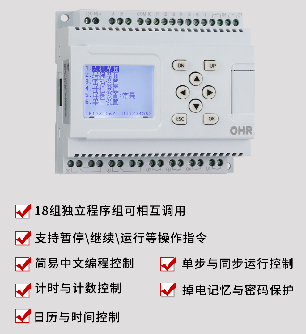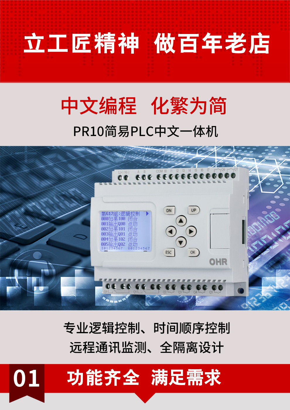 OHR-PR10系列簡易PLC中文一體機(jī)是一款中文可編程邏輯控制器,集邏輯判斷、輸出、延時、計時、計 數(shù)、跳轉(zhuǎn)、循環(huán)等功能于一體。適用于公共區(qū)域照明、綠化帶灌溉、養(yǎng)殖投喂控制、設(shè)備邏輯控制與時序控制。