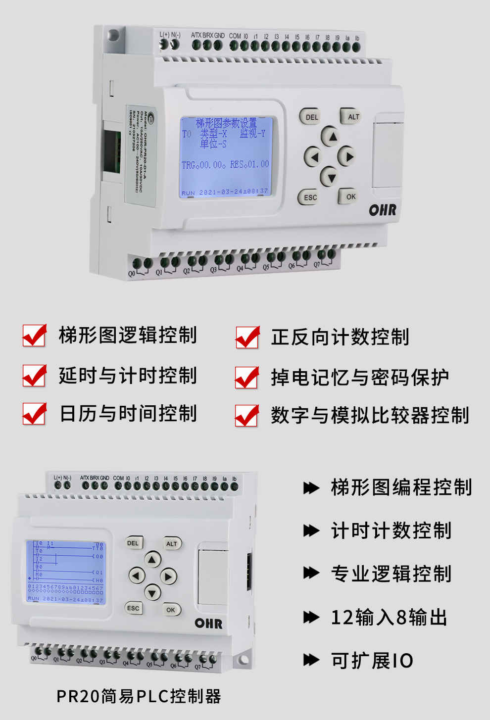 OHR-PR20系列簡易PLC控制器是一款結(jié)構(gòu)緊湊功能強(qiáng)大的控制器,集繼電器、定時(shí)器、計(jì)數(shù)器、日歷、時(shí)間開關(guān) 等功能于一體,可用于小規(guī)模應(yīng)用自動(dòng)化系統(tǒng)。