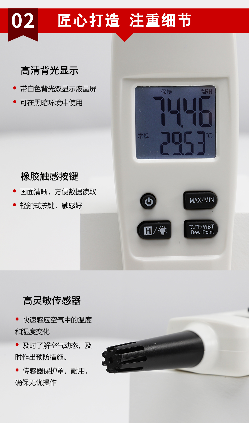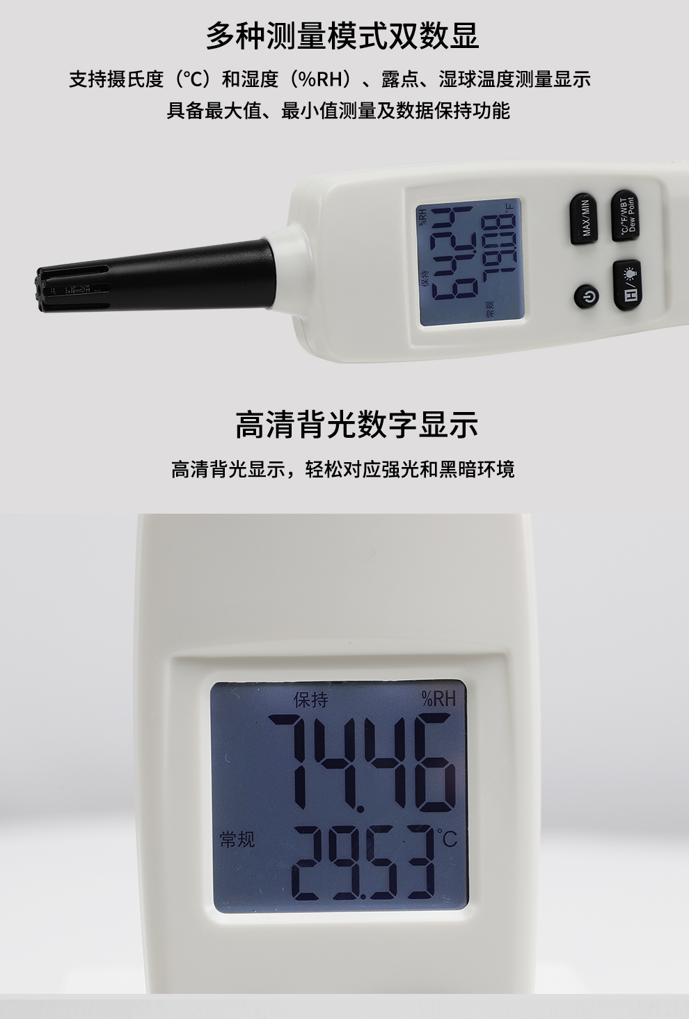 OHR-WS60系列手持式溫濕度檢測儀采用進(jìn)口空氣溫度/濕度傳感器,響應(yīng)時間快,具有空氣溫度、濕度、露點 溫度、濕球溫度測量功能,還具備最大值、最小值測量及數(shù)據(jù)保持功能。手持式高精度測量、小巧的外形便于攜 帶和使用,帶白色背光的雙顯示液晶屏可在黑暗環(huán)境中使用。