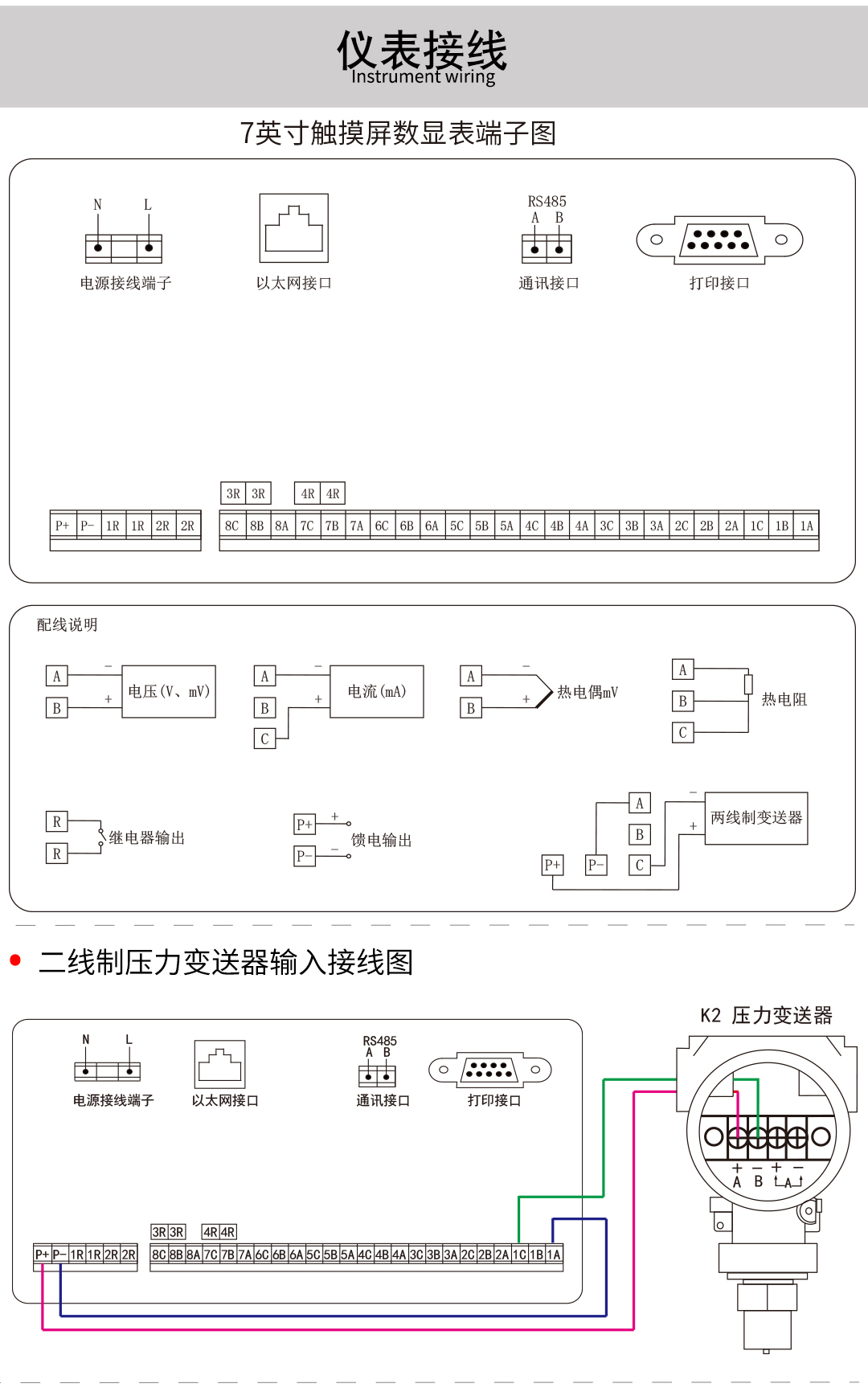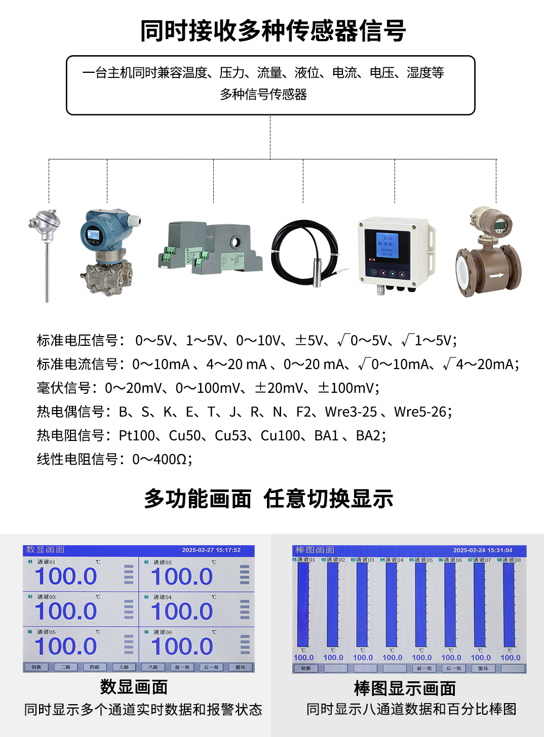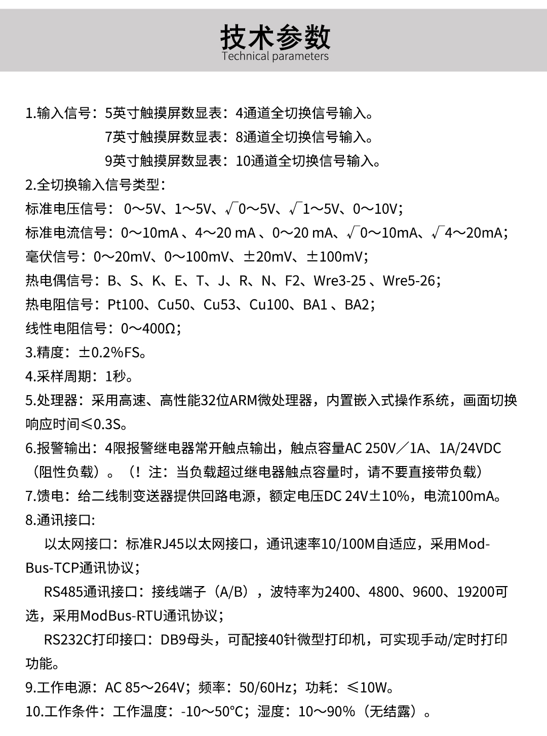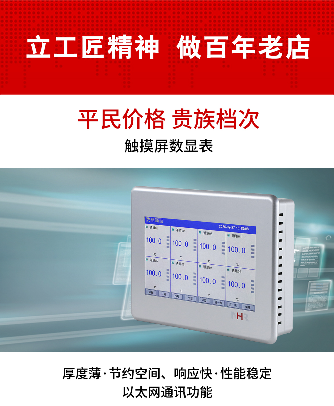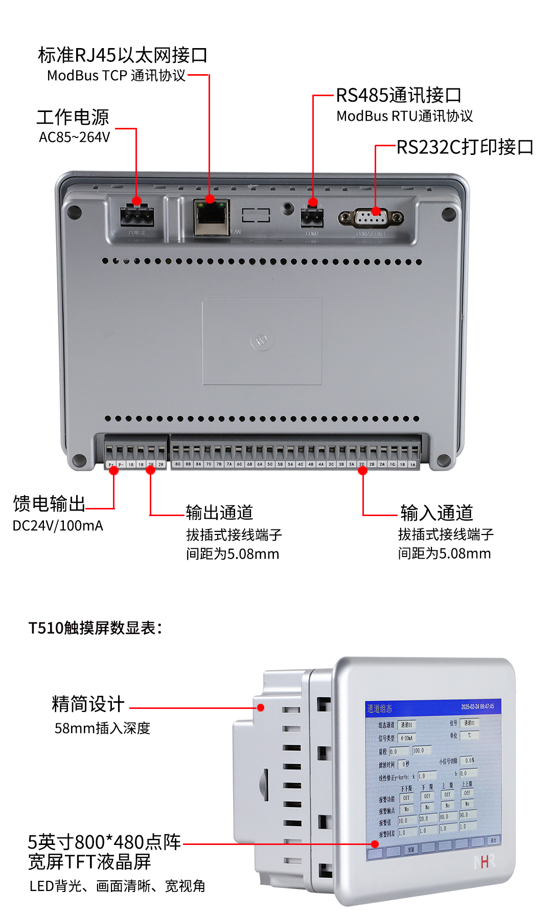 NHR系列觸摸屏數顯表采用新型大規(guī)模集成電路,對輸入、輸出、電源、信號采取可靠保護和強抗干擾設計。4路萬能信號輸入(可組態(tài)選擇輸入:標準電壓、標準電流、熱電偶、熱電阻、毫伏等)??蓭?路報警輸出,1個饋電輸出,RS485通訊接口,以太網接口,微型打印機接口;具有強大的顯示功能,實時測量顯示,棒圖顯示,報警狀態(tài)顯示,組態(tài)畫面顯示等。