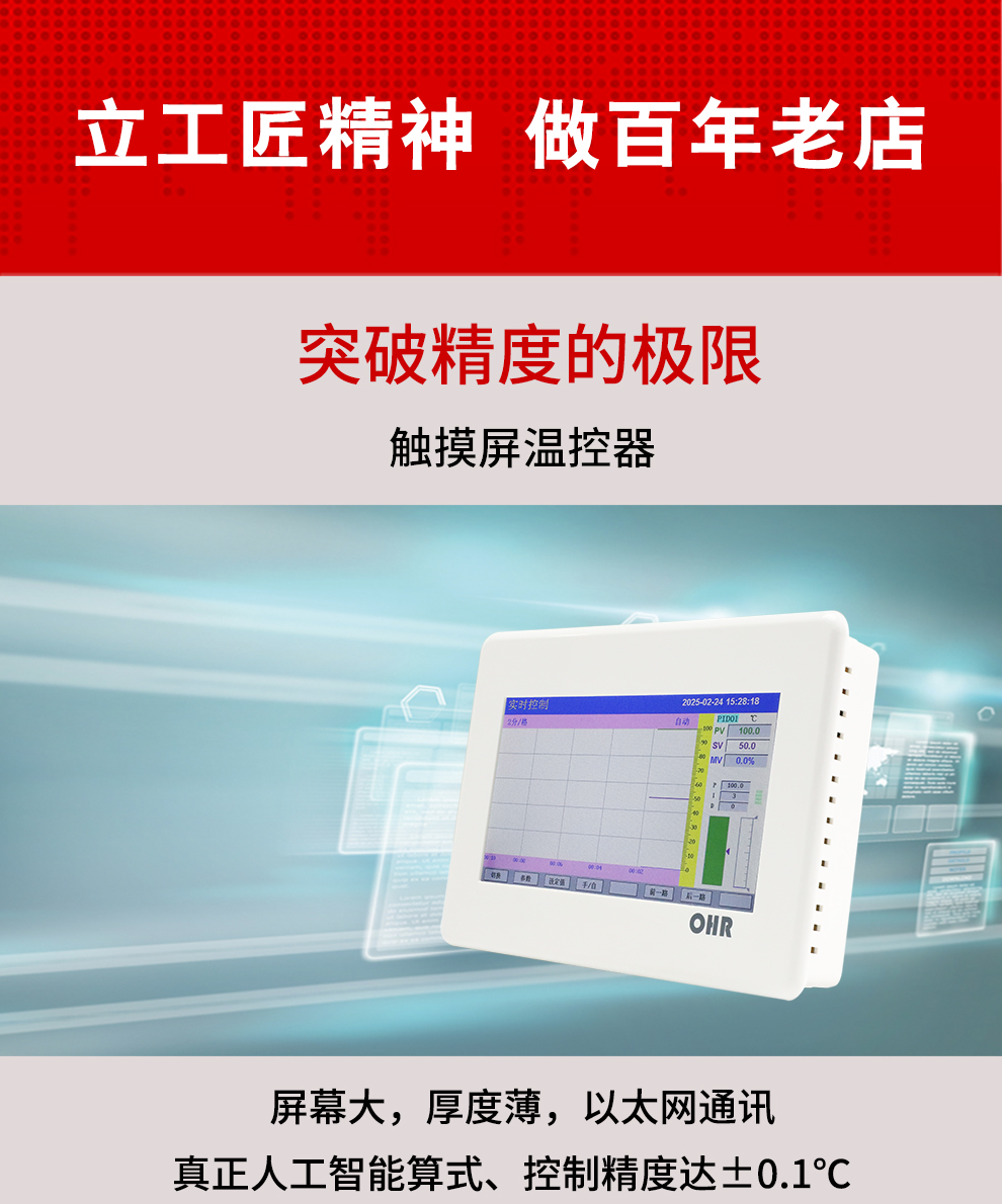 OHR系列觸摸屏溫控器采用真正的人工智能算式,儀表啟動(dòng)自整定功能,可以根據(jù)被控對(duì)象的特性,自動(dòng)尋找最優(yōu)參數(shù)以達(dá)到很好的控制效果,無(wú)需人工整定參數(shù)。控溫精度基本達(dá)±0.1℃,無(wú)超調(diào)、欠調(diào),達(dá)國(guó)際先進(jìn)水平。4路萬(wàn)能信號(hào)輸入,可帶2路PID 控制,RS485通訊接口,以太網(wǎng)接口。
