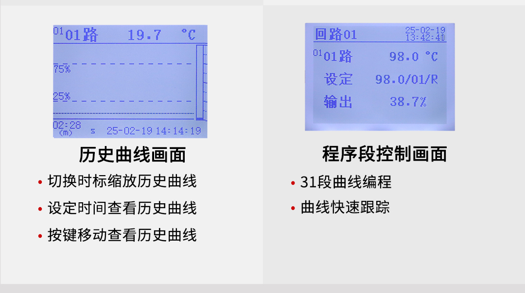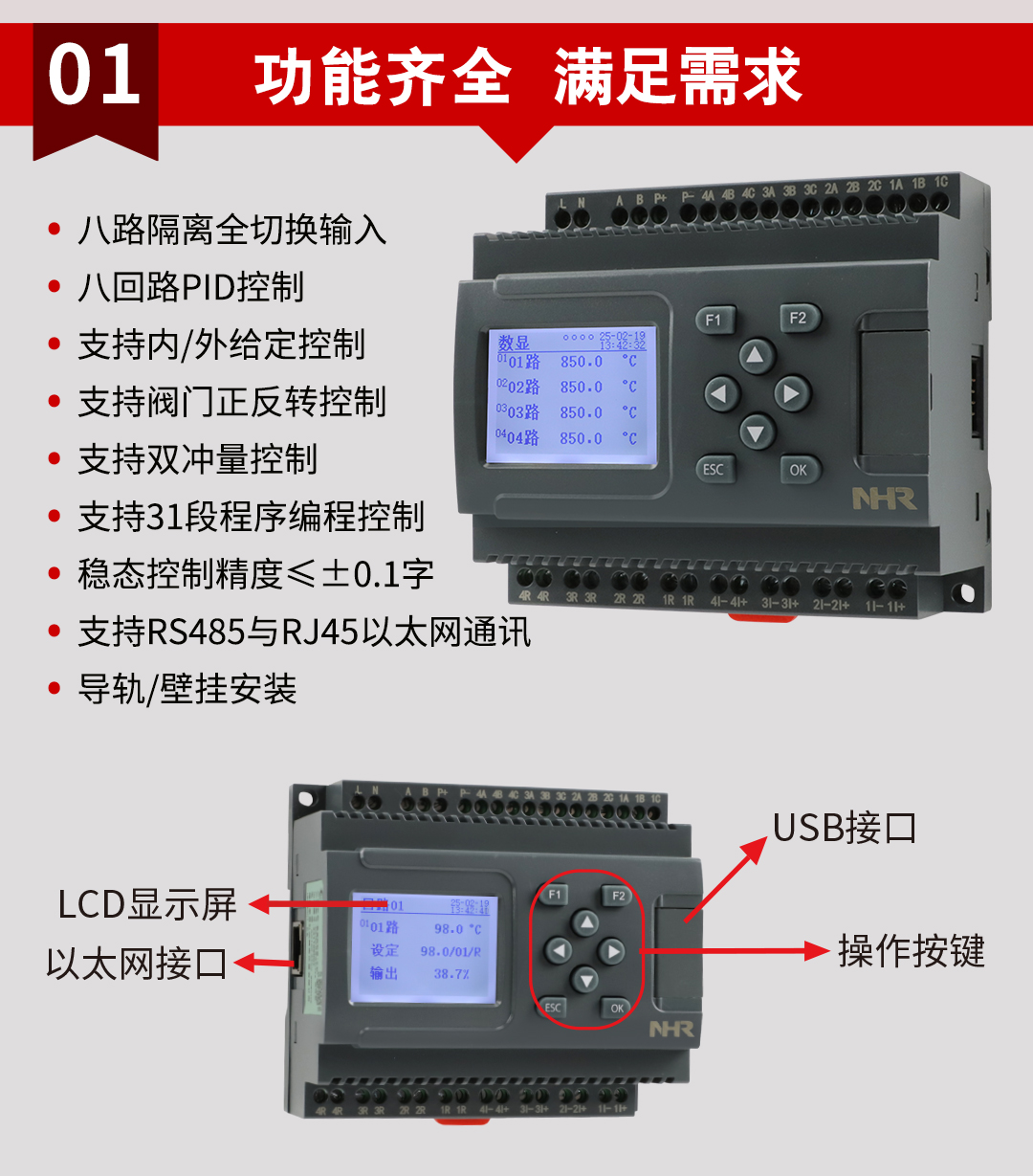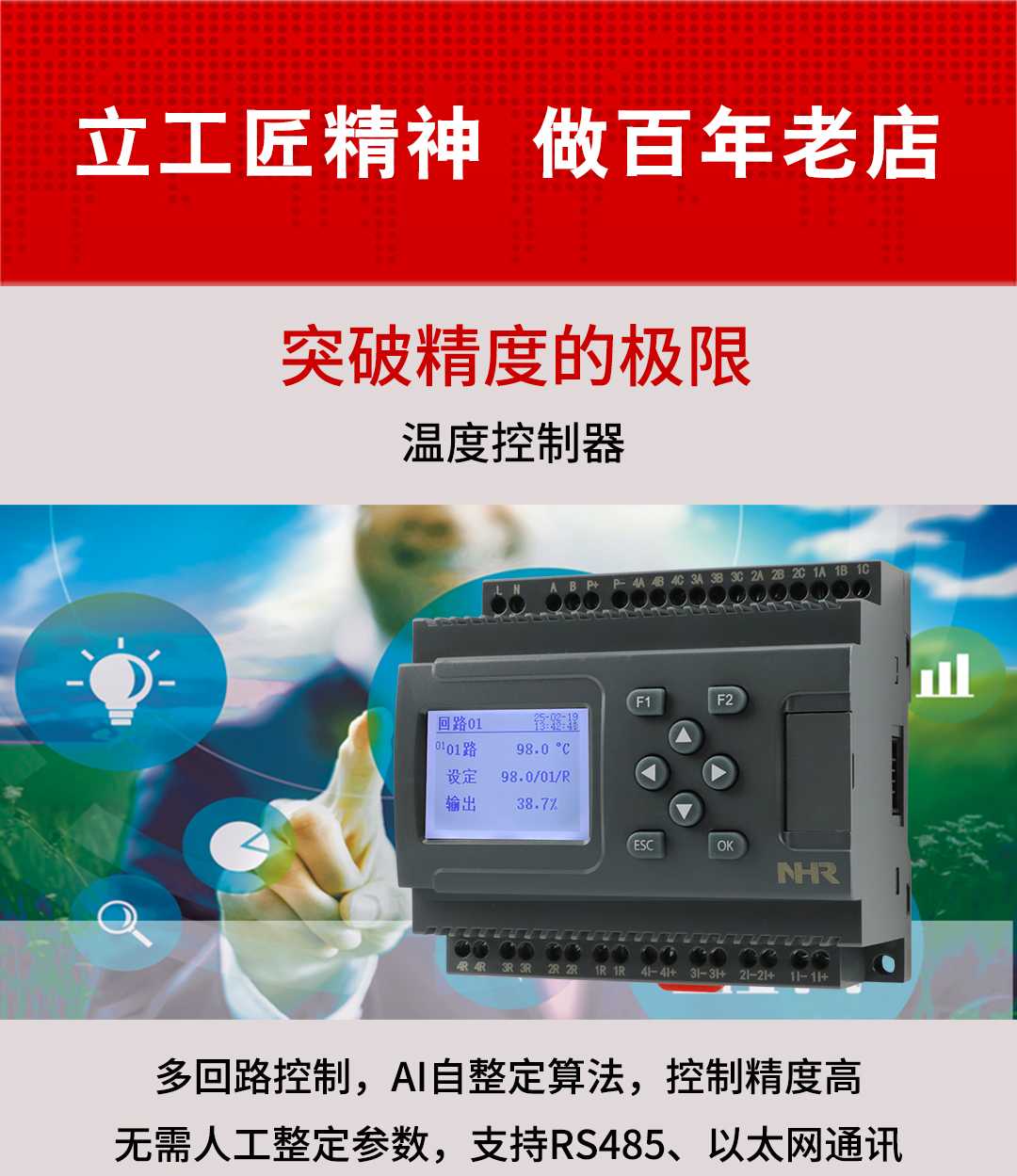 NHR-PR70系列溫度控制器采用真正的人工智能算式,儀表啟動自整定功能,可以根據(jù)被控對象的特性,自動尋找最優(yōu)參數(shù)以達到很好的控制效果,無需人工整定參數(shù)??販鼐然具_±0.1℃,無超調、欠調,達國際先進水平。可帶外給定(或閥位)控制,可取代伺服放大器直接驅動執(zhí)行機構;可進行編程控制,根據(jù)生產過程的要求,按照一定的程序曲線進行控制,最多可分31段曲線對控制對象進行監(jiān)測、控制、記錄與遠傳。