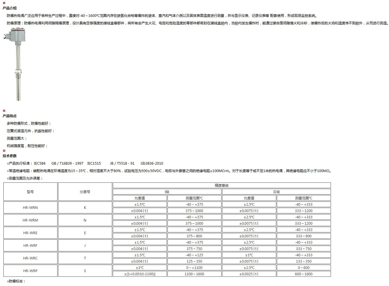 隔爆熱電偶是一種溫度傳感器,在化學工業(yè)自控系統(tǒng)中應(yīng)用極廣,通過溫度傳感器,可將控制對象的溫度參數(shù)變成電信號,傳遞給顯示、記錄和調(diào)節(jié)儀,對系統(tǒng)施行檢測、調(diào)節(jié)和控制。在化工廠,生產(chǎn)現(xiàn)場常伴有各種易燃、易爆等 化學氣體、蒸汽,如果使用普通的熱電偶非常不安全,極易引起環(huán)境氣體爆炸。