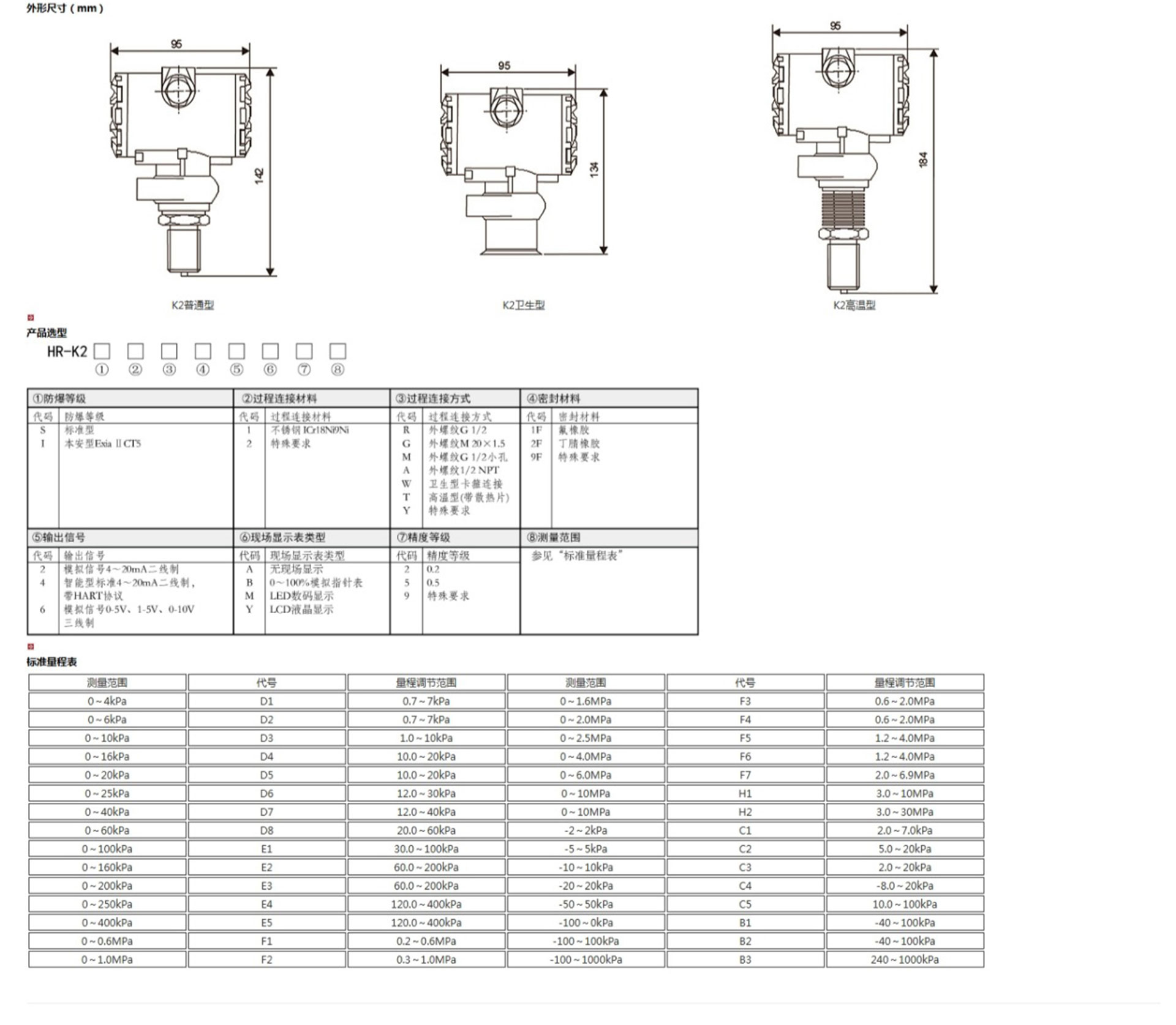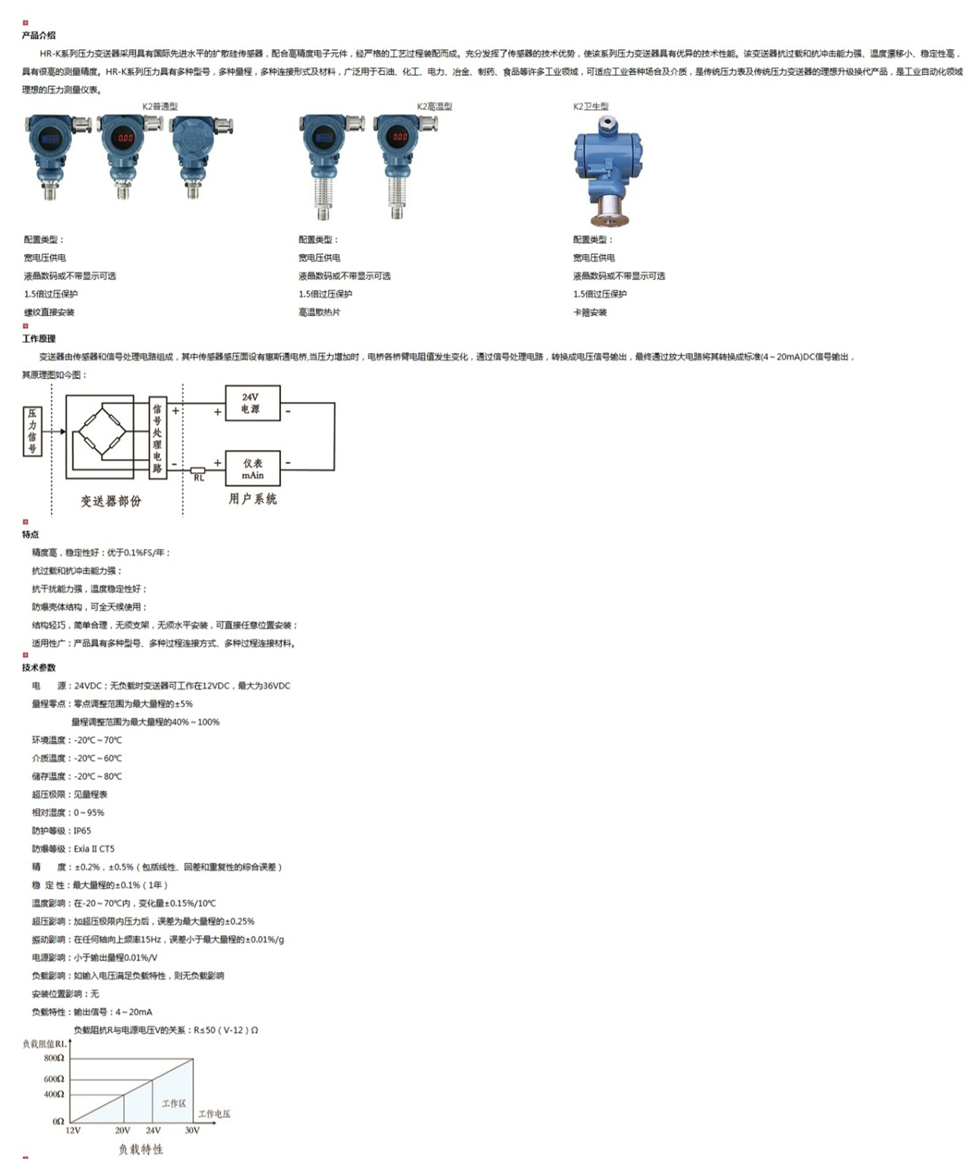 HR-K系列壓力變送器采用具有國際先進(jìn)水平的擴(kuò)散硅傳感器,配合高精度電子元件,經(jīng)嚴(yán)格的工藝過程裝配而成。充分發(fā)揮了傳感器的技術(shù)優(yōu)勢(shì),使該系列壓力變送器具有優(yōu)異的技術(shù)性能。該變送器抗過載和抗沖擊能力強(qiáng)、溫度漂移小、穩(wěn)定性高,具有很高的測(cè)量精度。