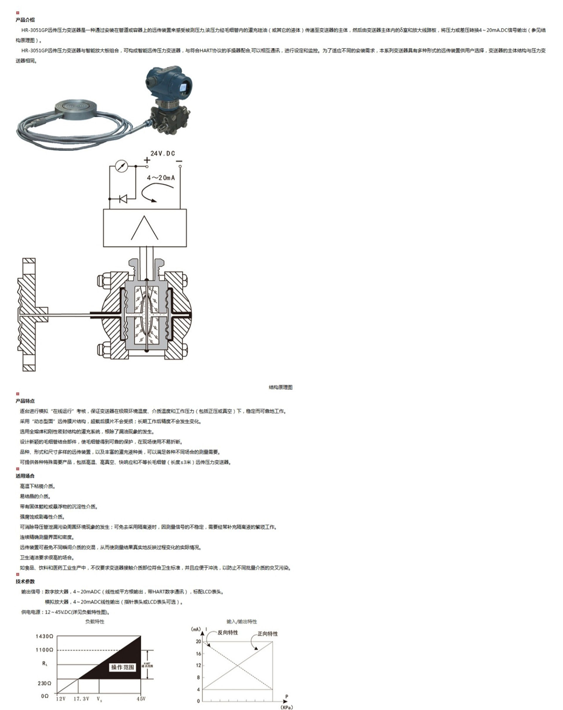 HR-3051GP遠傳壓力變送器是一種通過安裝在管道或容器上的遠傳裝置來感受被測壓力,該壓力經(jīng)毛細管內(nèi)的灌充硅油(或其它的液體)傳遞至變送器的主體,然后由變送器主體內(nèi)的δ室和放大線路板,將壓力或差壓轉(zhuǎn)換4~20mA.DC信號輸出。