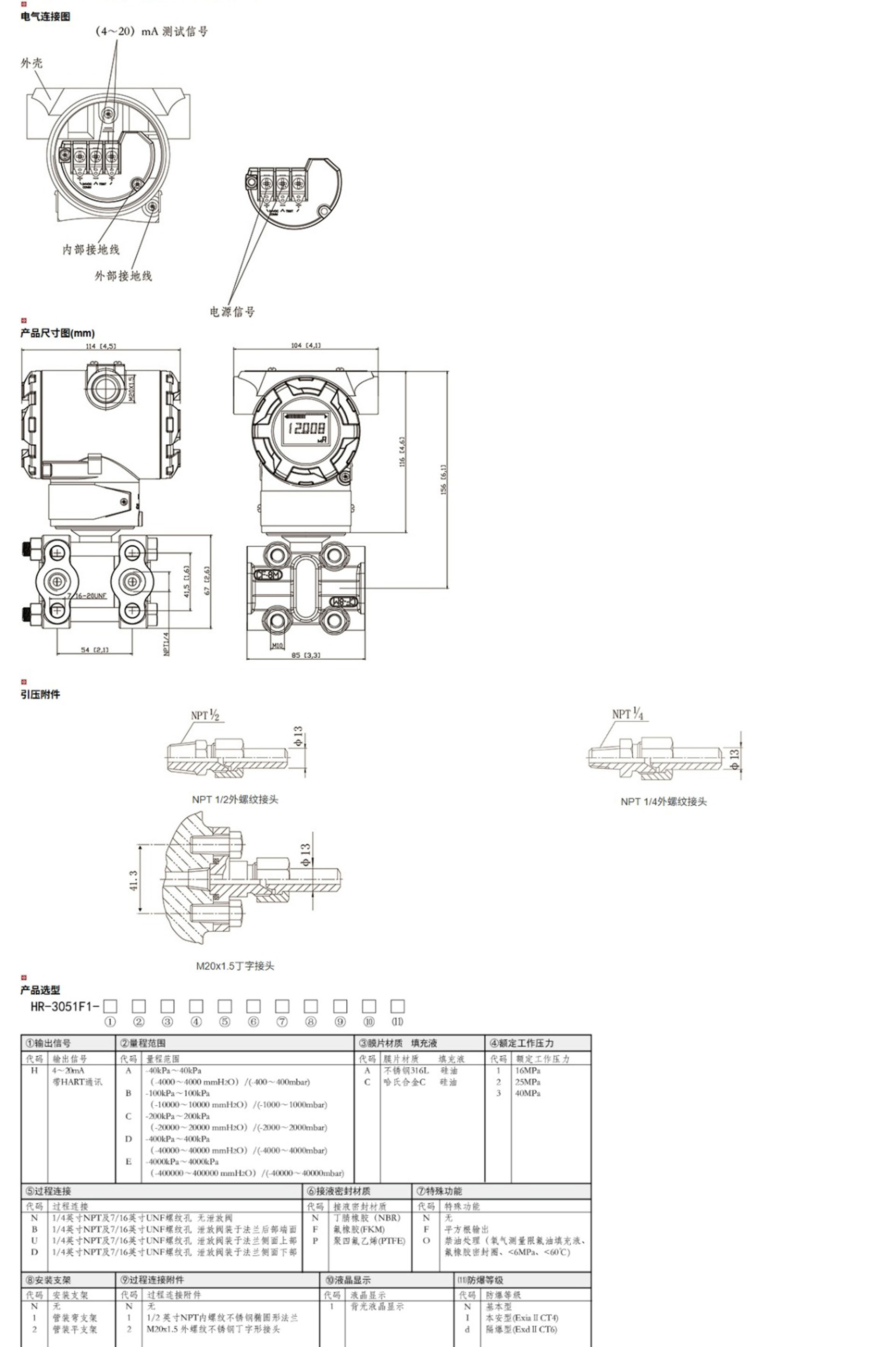 HR-3051F1智能單晶硅差壓變送器能準(zhǔn)確的測量差壓,并把它轉(zhuǎn)換成4~20mADC的輸出信號。該變送器可通過三按鍵本地操作,或通用手操器、組態(tài)軟件、以及手機(jī)APP遠(yuǎn)程操作,在不影響4~20mA DC的輸出信號的同時,進(jìn)行顯示與組態(tài)。