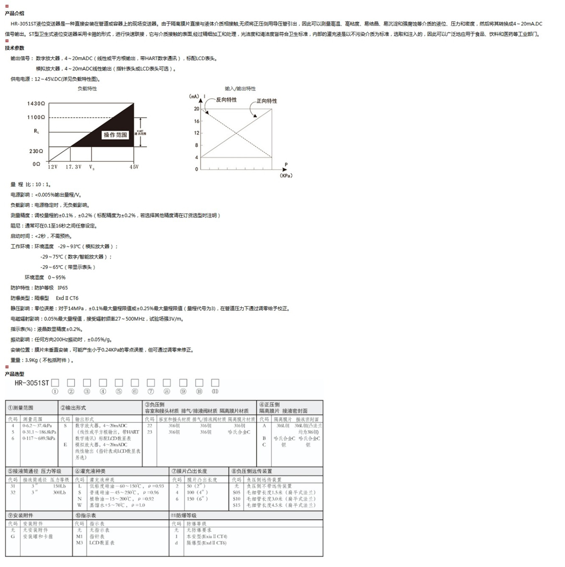 HR-3051ST液位變送器是一種直接安裝在管道或容器上的現(xiàn)場變送器。由于隔離膜片直接與液體介質(zhì)相接觸,無須將正壓側(cè)用導(dǎo)壓管引出,因此可以測量高溫、高粘度、易結(jié)晶、易沉淀和強(qiáng)腐蝕等介質(zhì)的液位、壓力和密度,然后將其轉(zhuǎn)換成4~20mA.DC信號輸出。