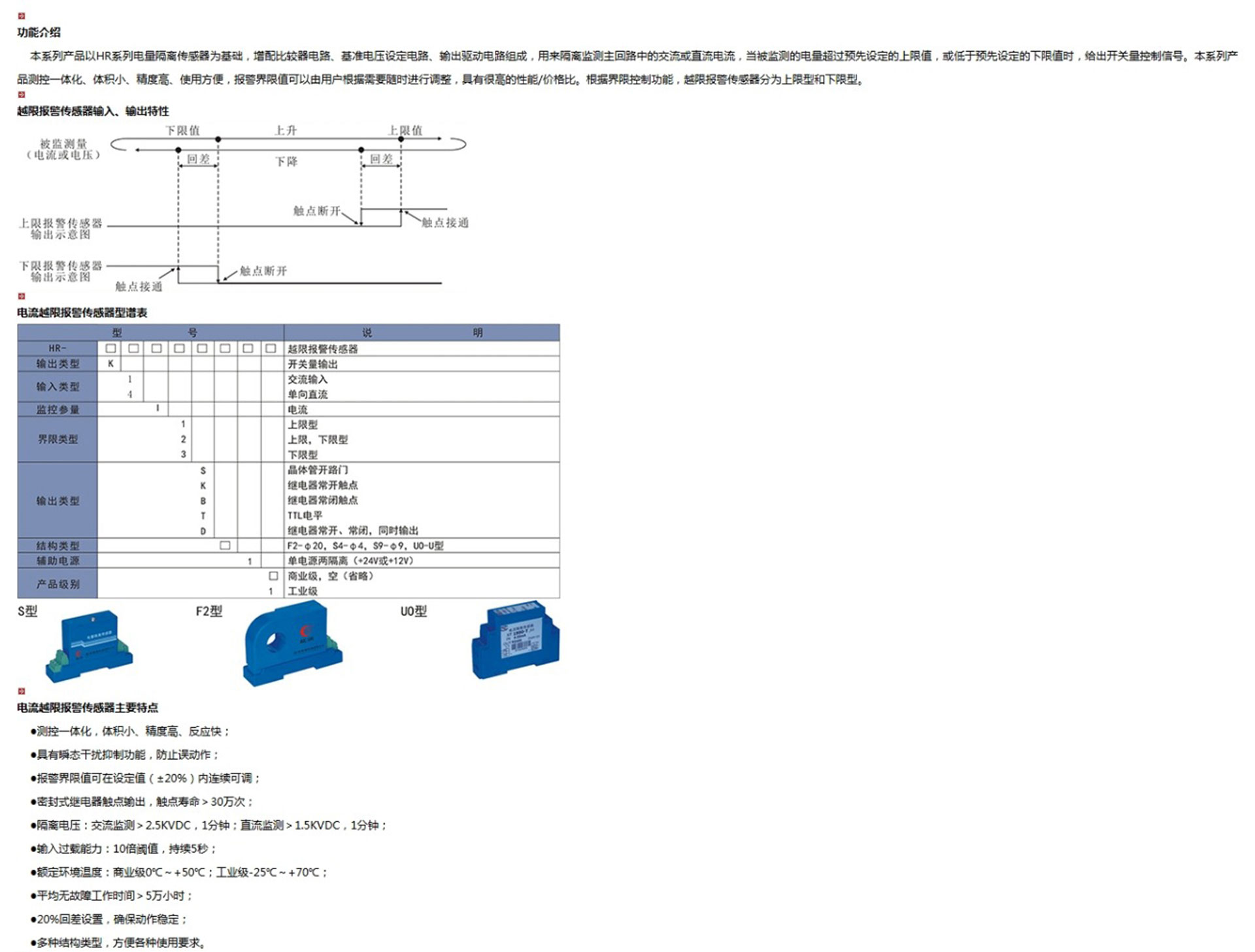 電流越限報(bào)警傳感器以HR系列電量隔離傳感器為基礎(chǔ),增配比較器電路、基準(zhǔn)電壓設(shè)定電路、輸出驅(qū)動(dòng)電路組成,用來隔離監(jiān)測(cè)主回路中的交流或直流電流,當(dāng)被監(jiān)測(cè)的電量超過預(yù)先設(shè)定的上限值,或低于預(yù)先設(shè)定的下限值時(shí),給出開關(guān)量控制信號(hào)。